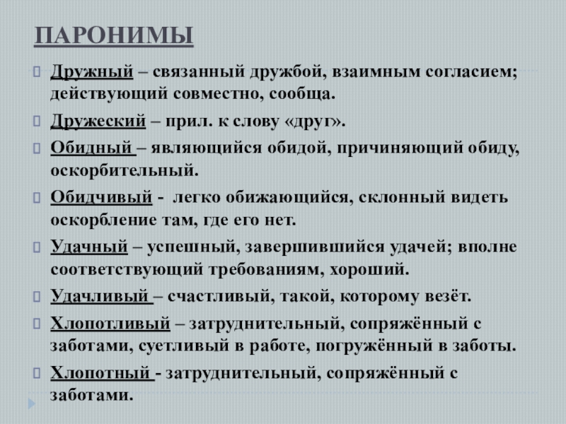ПАРОНИМЫДружный – связанный дружбой, взаимным согласием; действующий совместно, сообща.Дружеский – прил. к слову «друг».Обидный – являющийся обидой,
