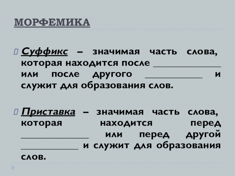 МОРФЕМИКАСуффикс – значимая часть слова, которая находится после _____________ или после другого ___________ и служит для образования