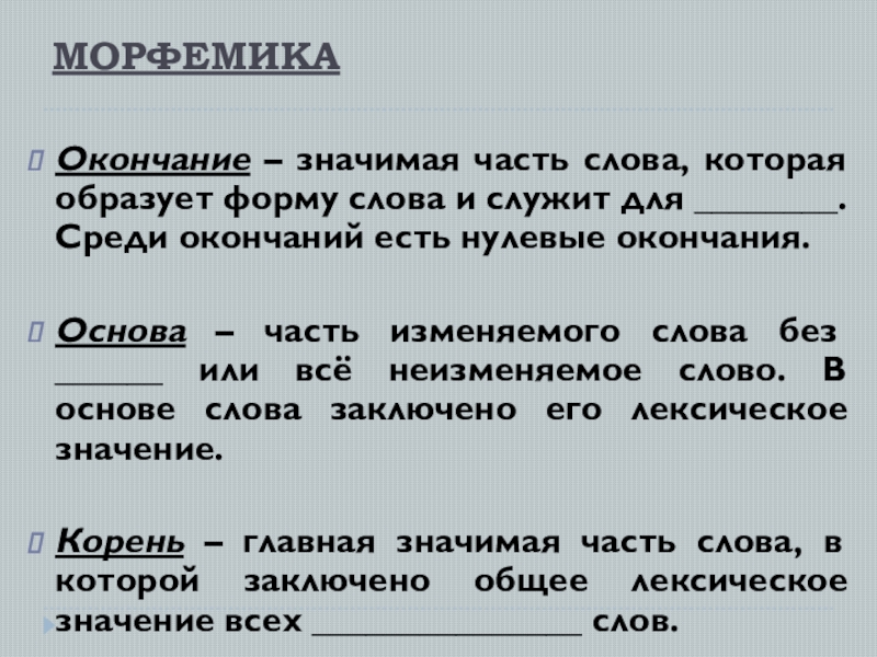 МОРФЕМИКАОкончание – значимая часть слова, которая образует форму слова и служит для ________. Среди окончаний есть нулевые