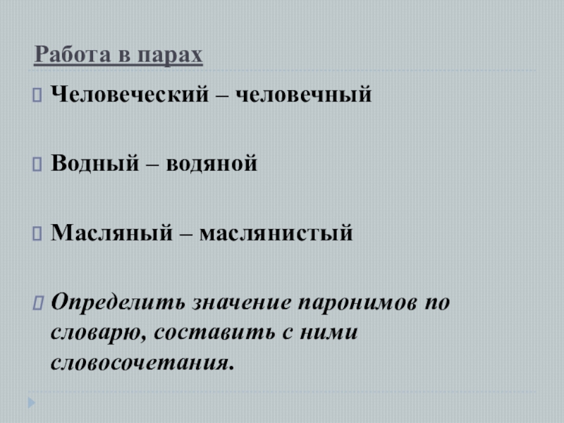 Работа в парахЧеловеческий – человечныйВодный – водянойМасляный – маслянистыйОпределить значение паронимов по словарю, составить с ними словосочетания.
