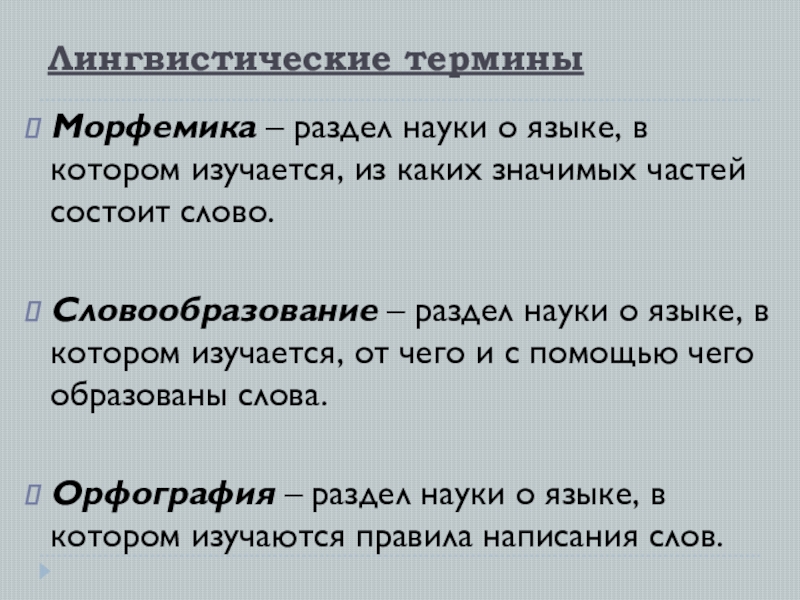 Лингвистические терминыМорфемика – раздел науки о языке, в котором изучается, из каких значимых частей состоит слово.Словообразование – раздел науки о языке, в котором изучается, от чего и с помощью чего образованы слова.Орфография – раздел науки о