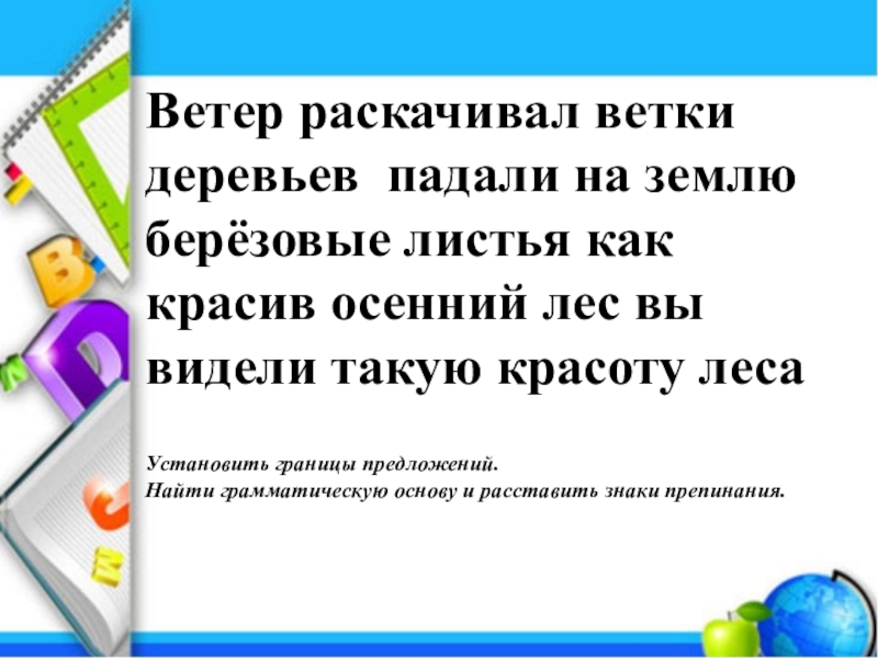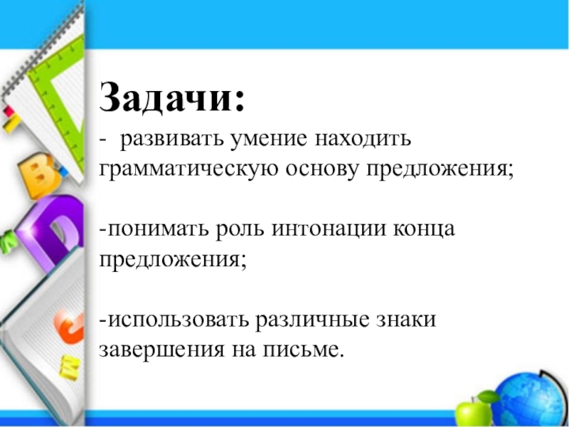 Задачи:  - развивать умение находить грамматическую основу предложения;-понимать роль интонации конца предложения; -использовать различные знаки завершения