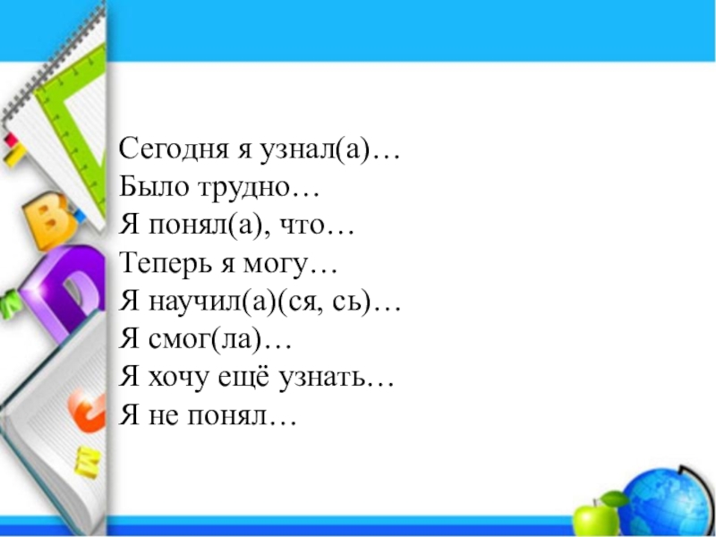 Сегодня я узнал(а)…Было трудно…Я понял(а), что…Теперь я могу…Я научил(а)(ся, сь)…Я смог(ла)…Я хочу ещё узнать…Я не понял…