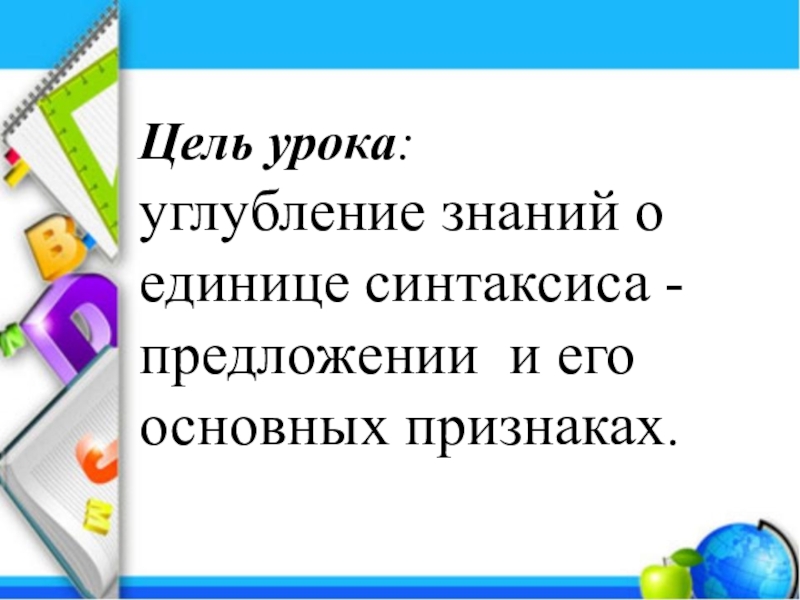 Цель урока: углубление знаний о единице синтаксиса - предложении и его основных признаках.