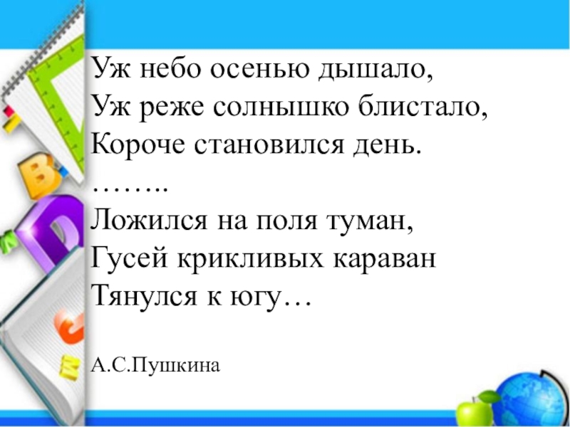 Уж небо осенью дышало,Уж реже солнышко блистало, Короче становился день.……..Ложился на поля туман, Гусей крикливых караванТянулся к югу…А.С.Пушкина