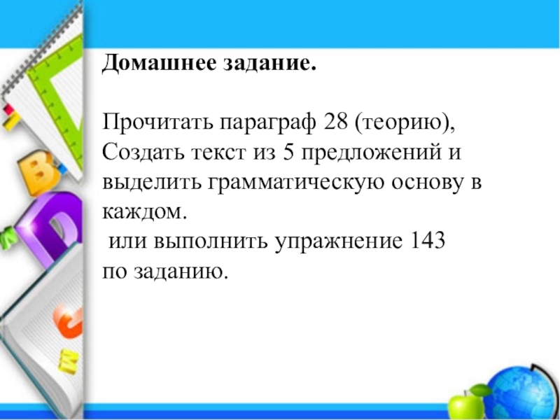 Домашнее задание. Прочитать параграф 28 (теорию), Создать текст из 5 предложений и выделить грамматическую основу в каждом. или