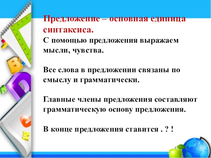 Предложение – основная единица синтаксиса. С помощью предложения выражаем мысли, чувства.Все слова в предложении связаны по смыслу