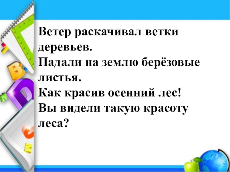 Ветер раскачивал ветки деревьев.Падали на землю берёзовые листья.Как красив осенний лес! Вы видели такую красоту леса?
