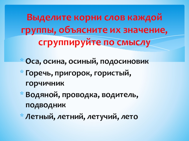 Выделите корни слов каждой группы, объясните их значение, сгруппируйте по смыслу