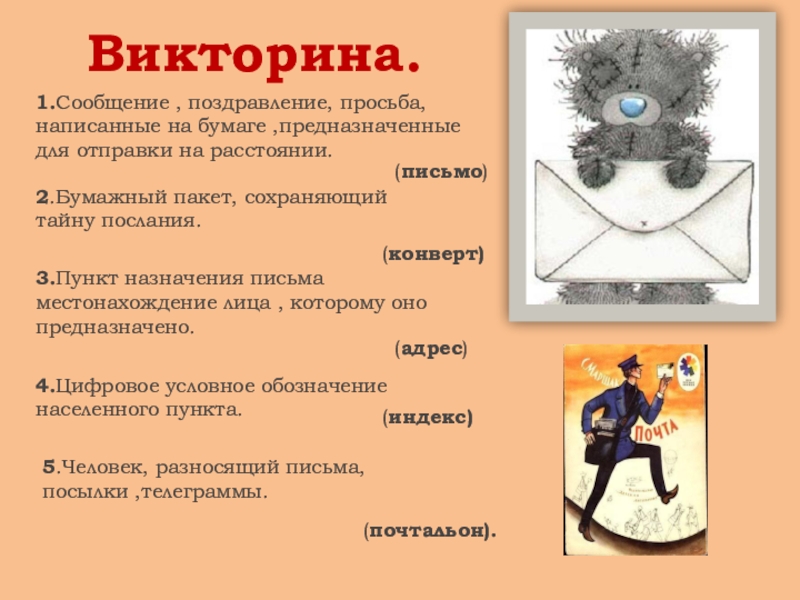 5.Человек, разносящий письма, посылки ,телеграммы.