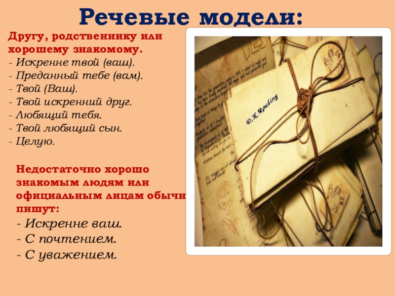 Недостаточно хорошо знакомым людям или официальным лицам обычно пишут: