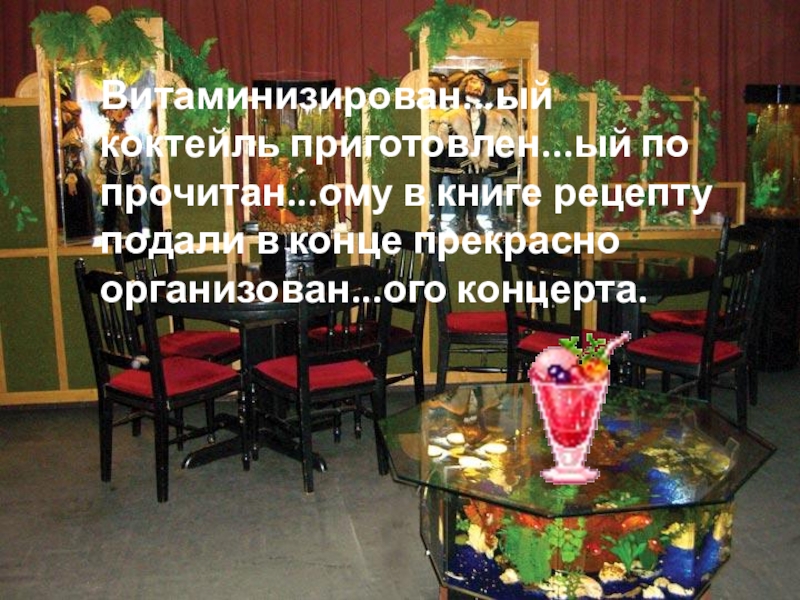 Слайд 5Витаминизирован...ый коктейль приготовлен...ый по прочитан...ому в книге рецепту подали в конце