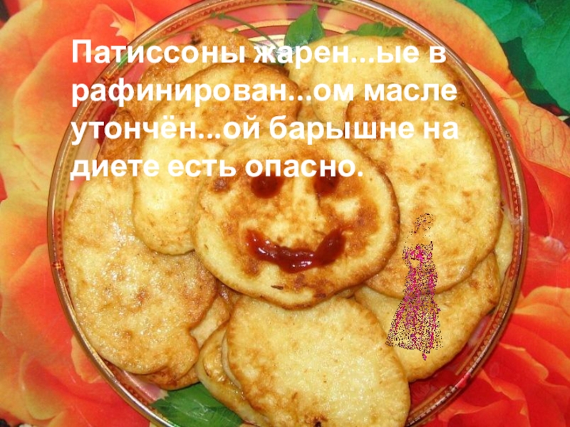 Слайд 8Патиссоны жарен...ые в рафинирован...ом масле утончён...ой барышне на диете есть опасно.