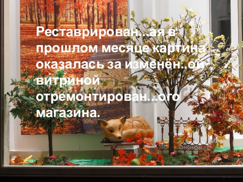 Слайд 3Реставрирован...ая в прошлом месяце картина оказалась за изменён..ой витриной отремонтирован...ого магазина.