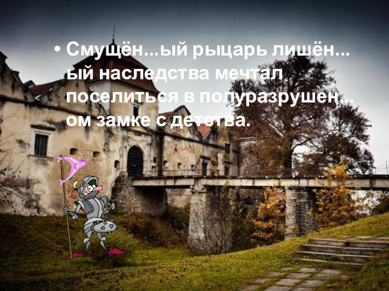 Слайд 4Смущён...ый рыцарь лишён...ый наследства мечтал поселиться в полуразрушен...ом замке с детства.