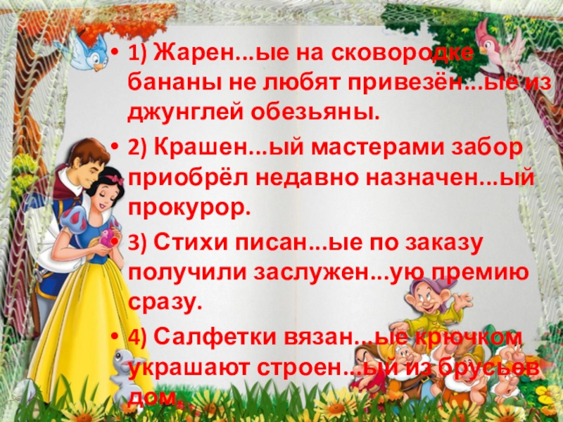 Слайд 91) Жарен...ые на сковородке бананы не любят привезён...ые из джунглей обезьяны.