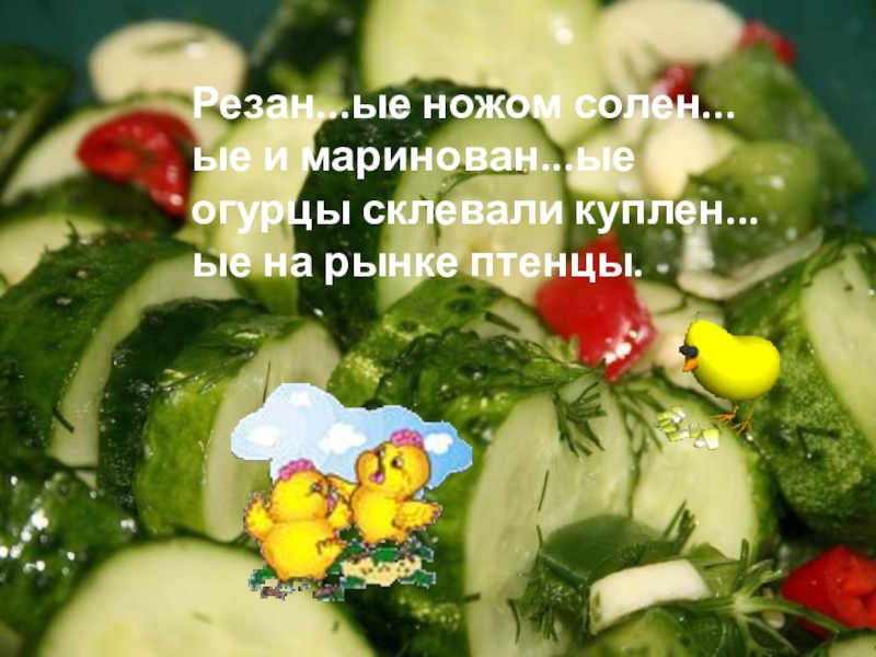 Слайд 2Резан...ые ножом солен...ые и маринован...ые огурцы склевали куплен...ые на рынке птенцы.