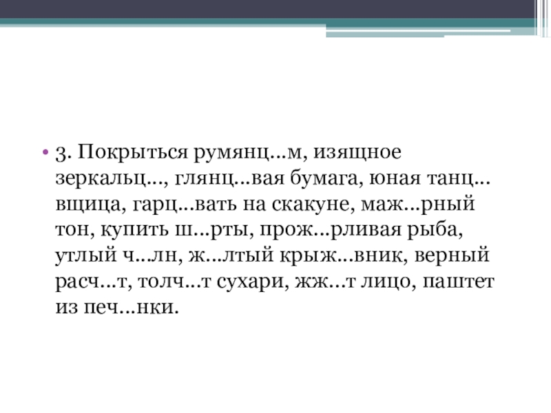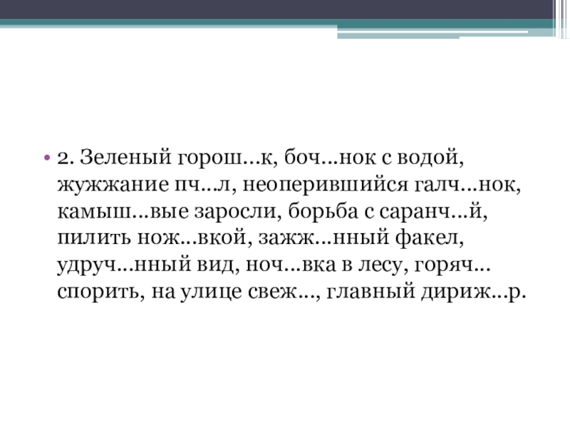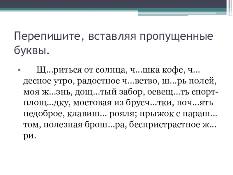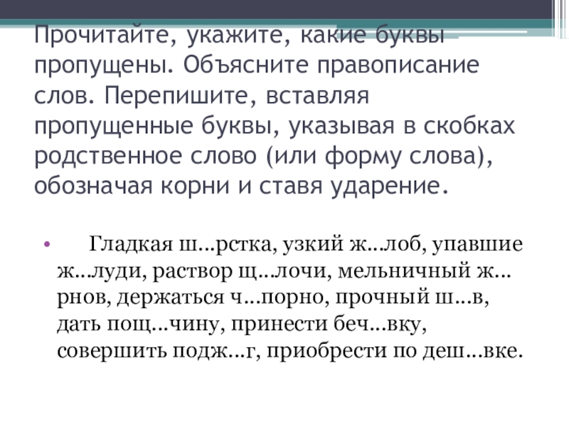 Гладкая ш...рстка, узкий ж...лоб, упавшие ж...луди, раствор щ...лочи, мельничный ж...рнов, держаться ч...порно, прочный ш...в, дать пощ...чину, принести беч...вку, совершить подж...г, приобрести по деш...вке.