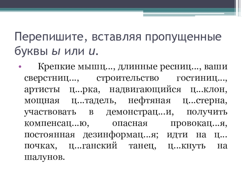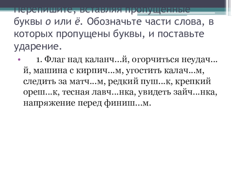 1. Флаг над каланч...й, огорчиться неудач...й, машина с кирпич...м, угостить калач...м, следить за матч...м, редкий пуш...к, крепкий ореш...к, тесная лавч...нка, увидеть зайч...нка, напряжение перед финиш...м.