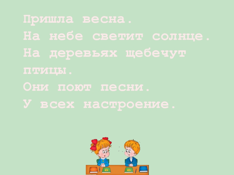 Пришла весна.На небе светит солнце.На деревьях щебечут птицы.Они поют песни.У всех настроение.