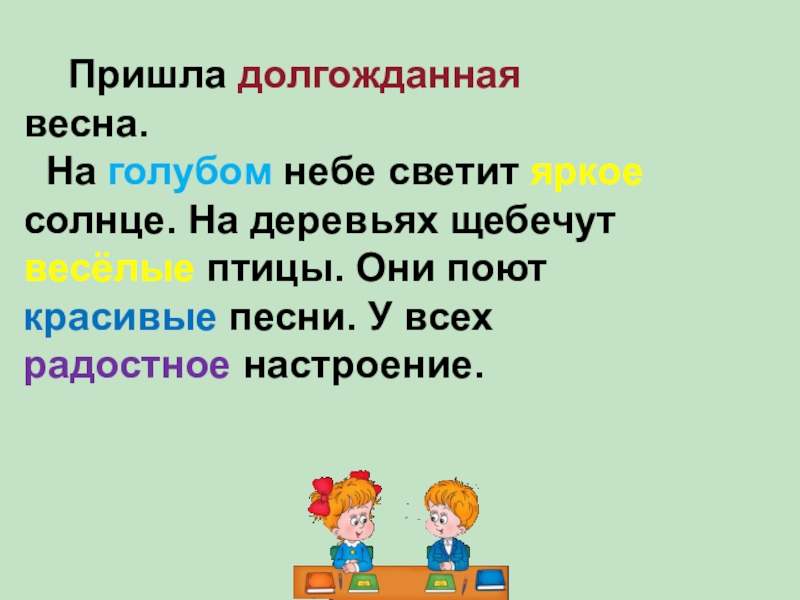 Пришла долгожданная весна.  На голубом небе светит яркое солнце. На деревьях щебечут весёлые птицы.