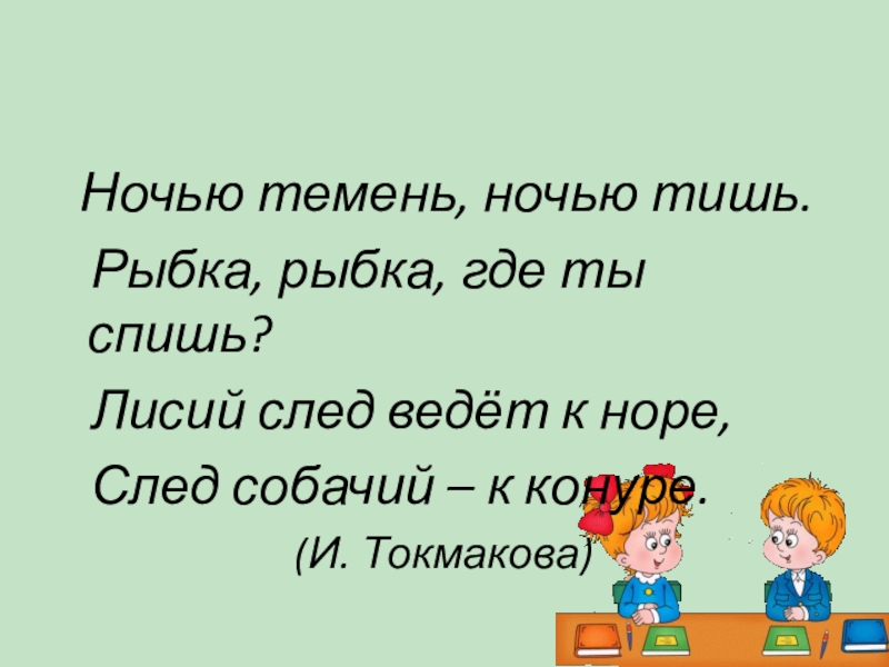 Ночью темень, ночью тишь.  Рыбка, рыбка, где ты спишь?  Лисий след ведёт к