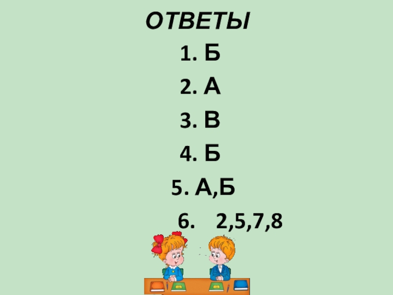 ОТВЕТЫ1. Б2. А3. В4. Б 5. А,Б     6.  2,5,7,8