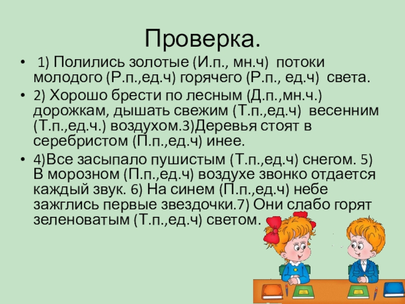 2) Хорошо брести по лесным (Д.п.,мн.ч.) дорожкам, дышать свежим (Т.п.,ед.ч) весенним (Т.п.,ед.ч.) воздухом.3)Деревья стоят в серебристом (П.п.,ед.ч) инее.