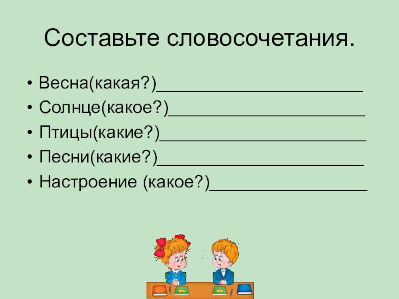 Составьте словосочетания.Весна(какая?)_____________________Солнце(какое?)____________________Птицы(какие?)_____________________Песни(какие?)_____________________Настроение (какое?)________________
