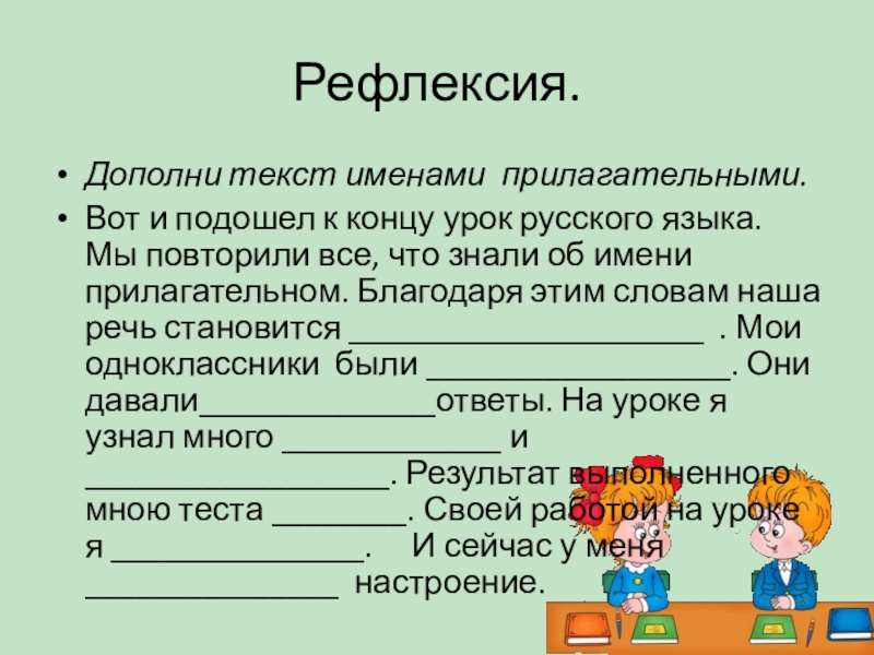 Рефлексия.Дополни текст именами  прилагательными.Вот и подошел к концу урок русского языка. Мы повторили все, что знали об