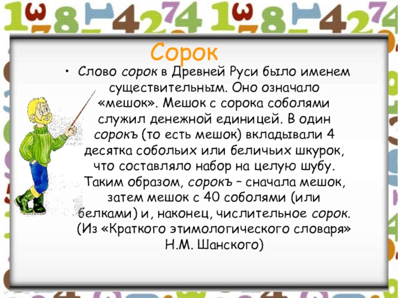 Слово сорок в Древней Руси было именем существительным. Оно означало «мешок».