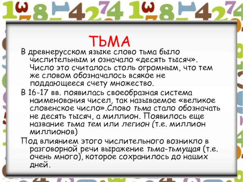 В древнерусском языке слово тьма было числительным и означало «десять тысяч».