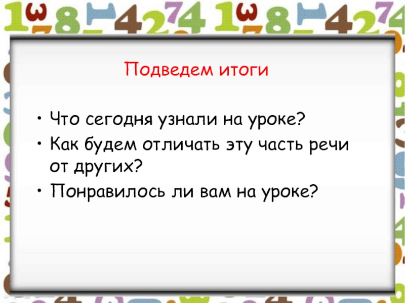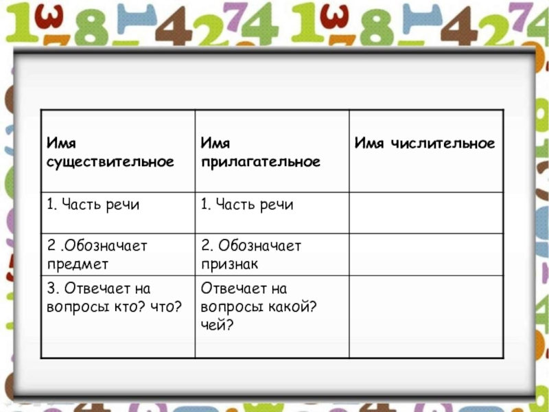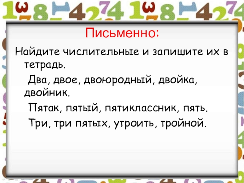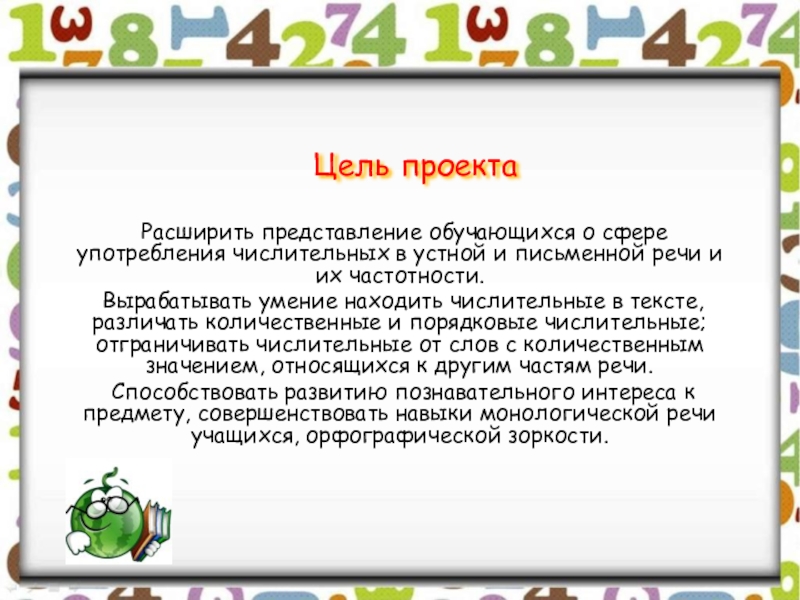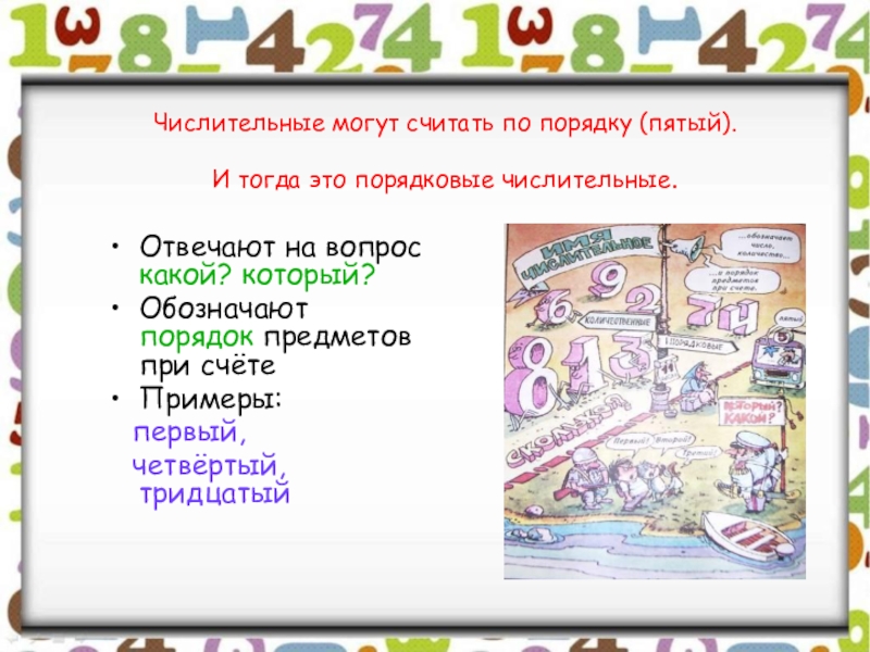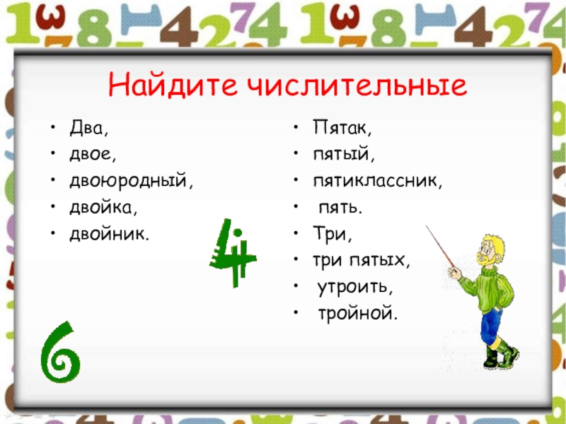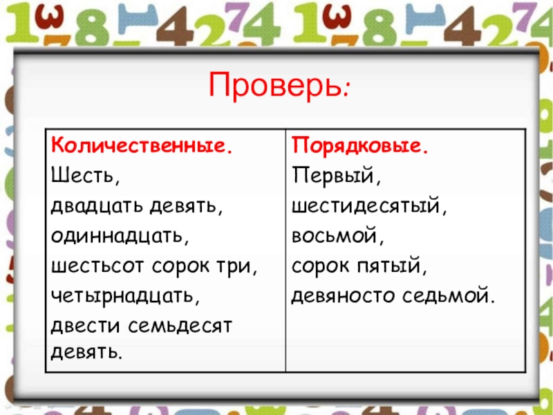 Вырабатывать умение находить числительные в тексте, различать количественные и порядковые числительные; отграничивать числительные от слов с количественным значением, относящихся к другим частям речи.