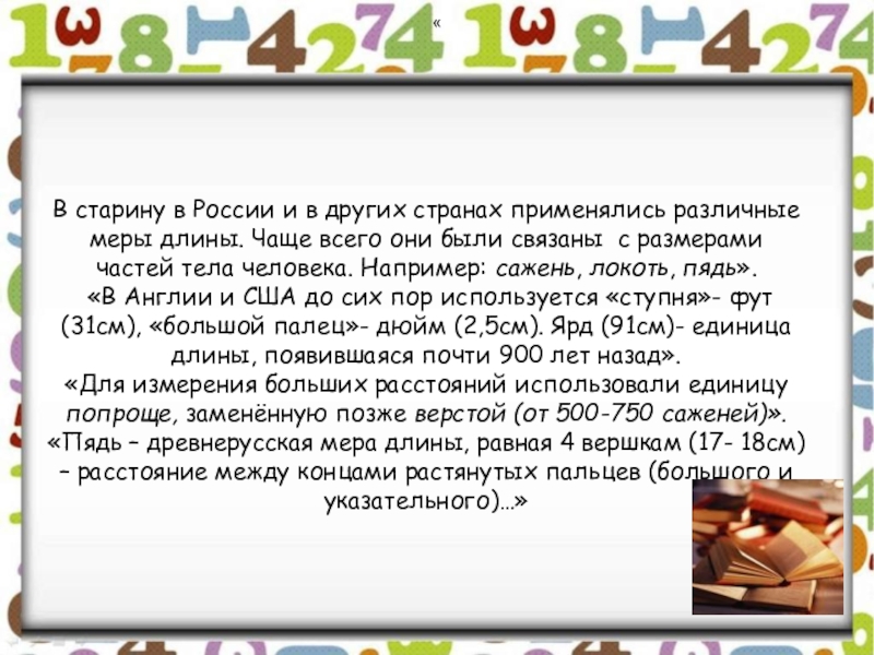 длины. Чаще всего они были связаны с размерами частей тела человека. Например: сажень, локоть, пядь».