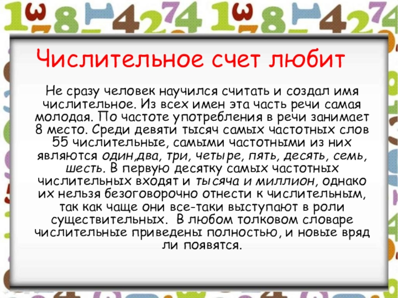 Из всех имен эта часть речи самая молодая. По частоте употребления в речи занимает 8 место. Среди девяти тысяч самых частотных слов 55 числительные, самыми частотными из них являются один,два, три, четыре, пять, десять, семь, шесть. В первую десятку самых частотных числительных входят и тысяча и миллион, однако их нельзя безоговорочно отнести к числительным, так как чаще они все-таки выступают в роли существительных. В любом толковом словаре числительные приведены полностью, и новые вряд ли появятся.