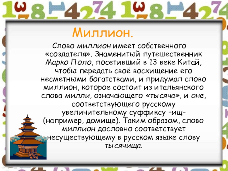 Слово миллион имеет собственного «создателя». Знаменитый путешественник Марко Поло, посетивший в
