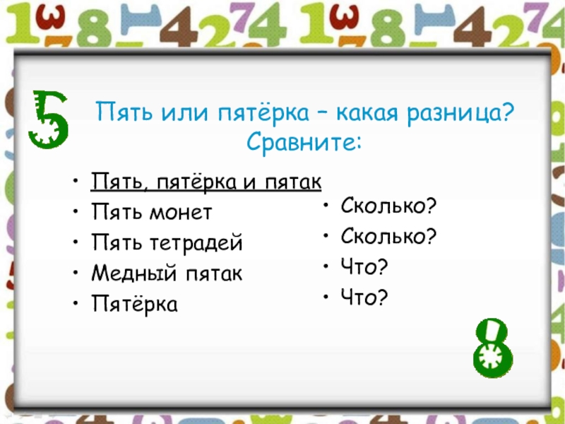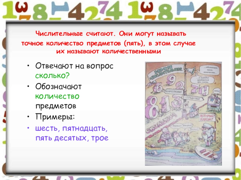 Слайд 17 Числительные считают. Они могут называть точное количество предметов (пять), в