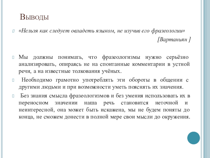 Без знания смысла фразеологизмов и без умения использовать их в переносном значении наша речь становится неточной и неинтересной, она может быть искажена, мы не будем поняты до конца, не сможем донести в полной мере свои мысли до окружения.