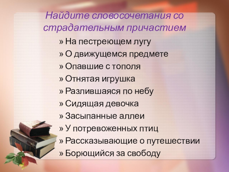 Найдите словосочетания со страдательным причастиемНа пестреющем лугуО движущемся предметеОпавшие с тополяОтнятая игрушкаРазлившаяся по небуСидящая девочкаЗасыпанные аллеиУ потревоженных