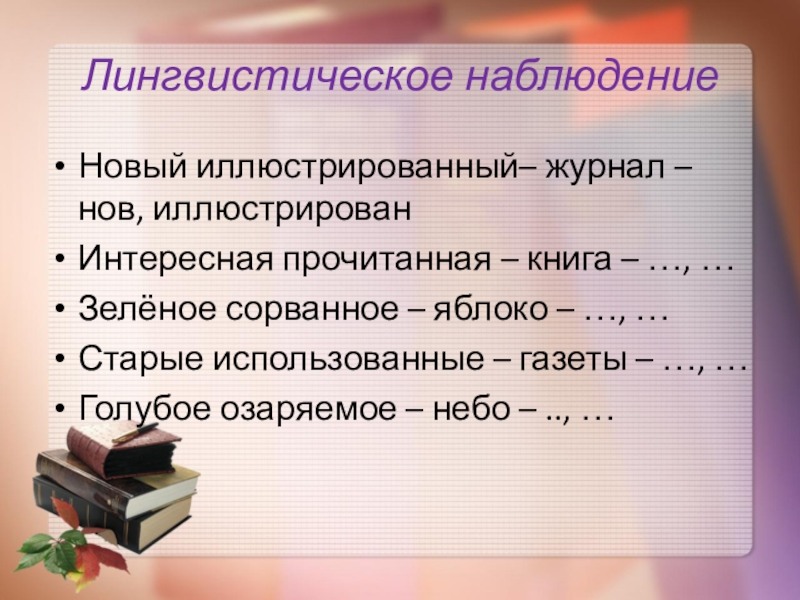 Лингвистическое наблюдениеНовый иллюстрированный– журнал – нов, иллюстрированИнтересная прочитанная – книга – …, …Зелёное сорванное – яблоко –