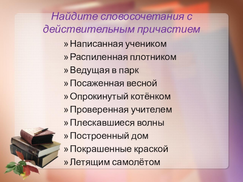 Найдите словосочетания с действительным причастиемНаписанная ученикомРаспиленная плотникомВедущая в паркПосаженная веснойОпрокинутый котёнкомПроверенная учителемПлескавшиеся волныПостроенный домПокрашенные краскойЛетящим самолётом
