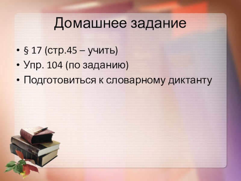 Домашнее задание§ 17 (стр.45 – учить)Упр. 104 (по заданию)Подготовиться к словарному диктанту