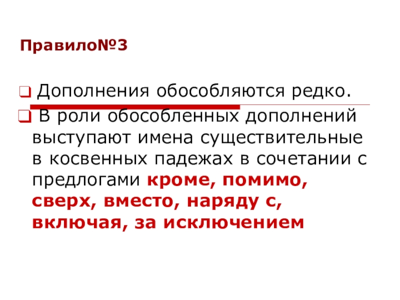 существительные в косвенных падежах в сочетании с предлогами кроме, помимо, сверх, вместо, наряду с, включая, за исключением