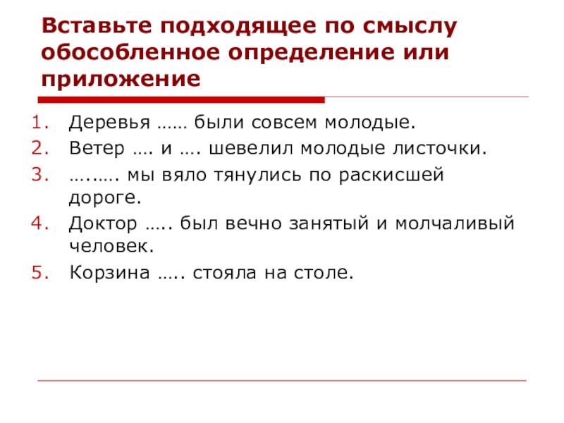 Слайд 19Вставьте подходящее по смыслу обособленное определение или приложение
