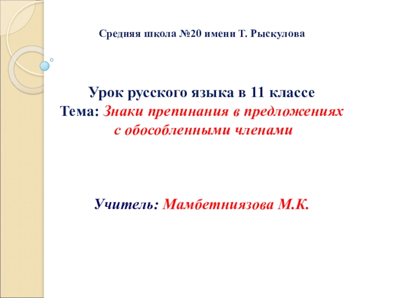 Слайд 1Средняя школа №20 имени Т. Рыскулова