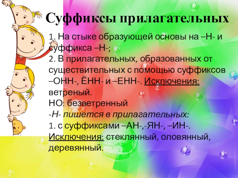 Суффиксыприлагательных1. На стыке образующей основы на –Н- и суффикса –Н-;2. В прилагательных, образованных от существительных с помощью