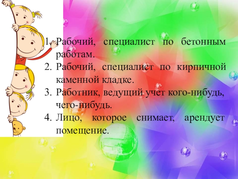 Рабочий, специалист по бетонным работам.Рабочий, специалист по кирпичной каменной кладке.Работник, ведущий учет кого-нибудь, чего-нибудь.Лицо, которое снимает, арендует помещение.