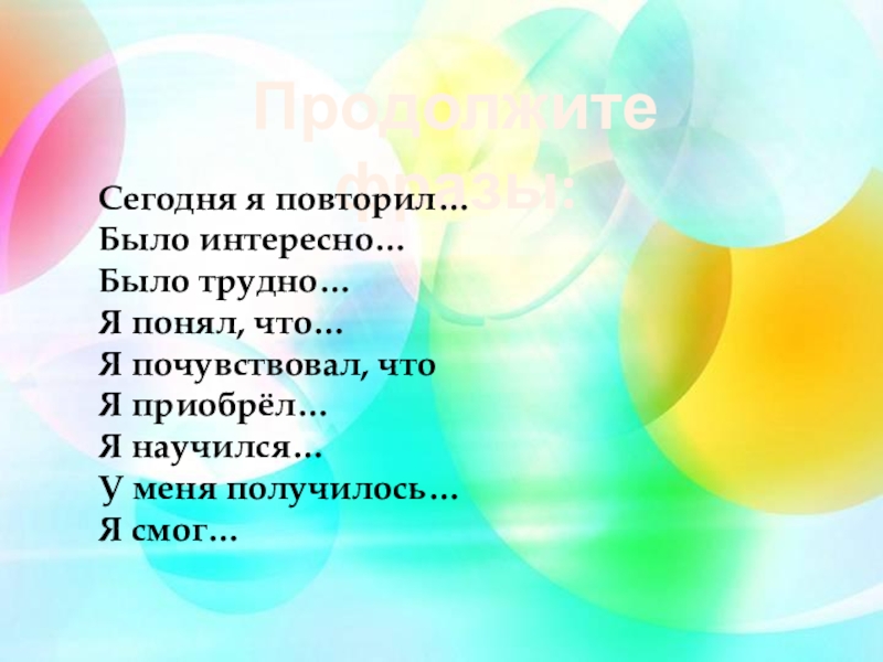 Продолжите фразы:Сегодня я повторил…Было интересно…Было трудно…Я понял, что…Я почувствовал, чтоЯ приобрёл…Я научился…У меня получилось…Я смог…