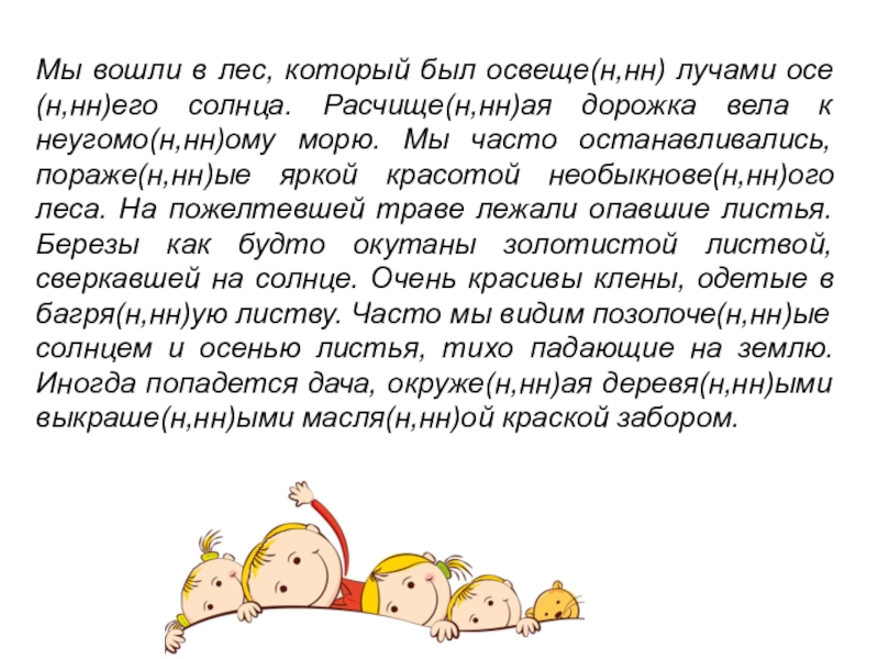 Слайд 6Мы вошли в лес, который был освеще(н,нн) лучами осе(н,нн)его солнца. Расчище(н,нн)ая
