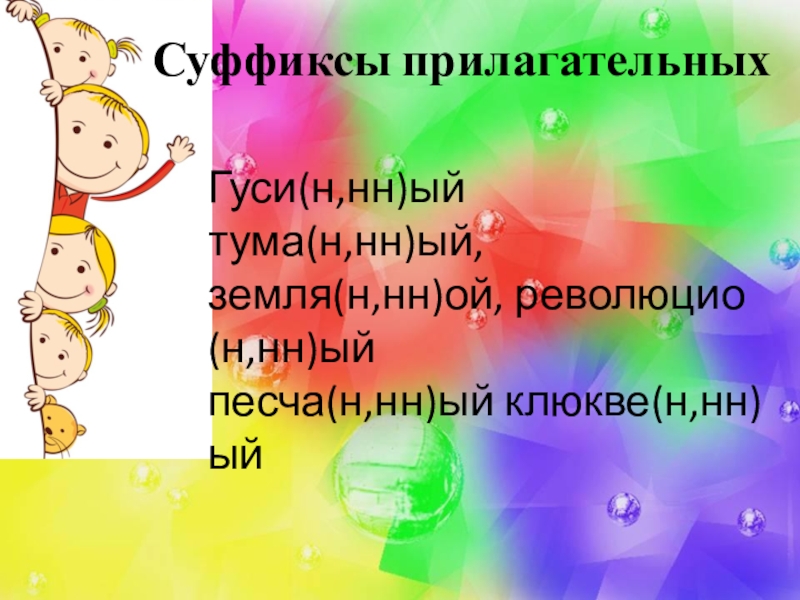 СуффиксыприлагательныхГуси(н,нн)ый тума(н,нн)ый,земля(н,нн)ой, революцио(н,нн)ыйпесча(н,нн)ый клюкве(н,нн)ый